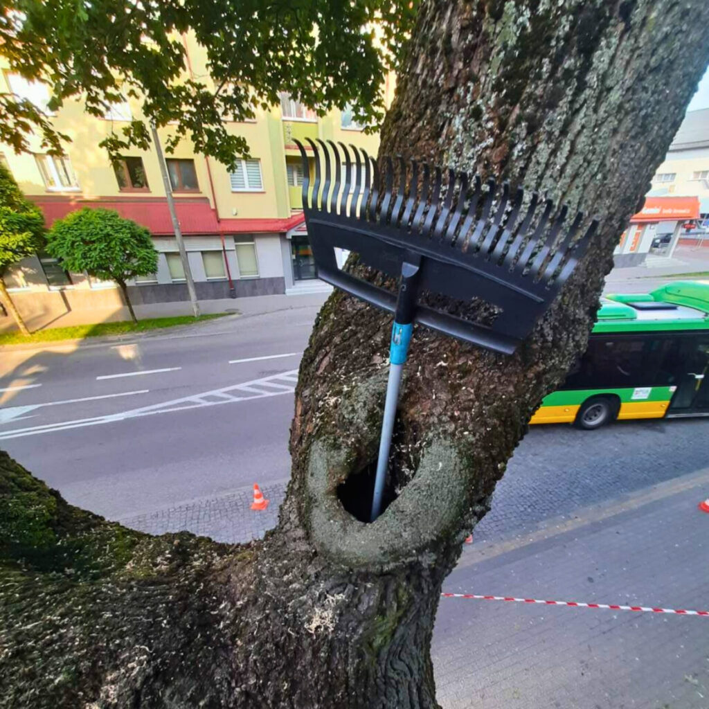 – w pustej przestrzeni wewnątrz pnia trzonek od grabi dał się wsunąć na głębokość ponad jednego metra. To jednoznacznie potwierdza, że w obecnym stanie drzewo nie jest w pełni stabilne.