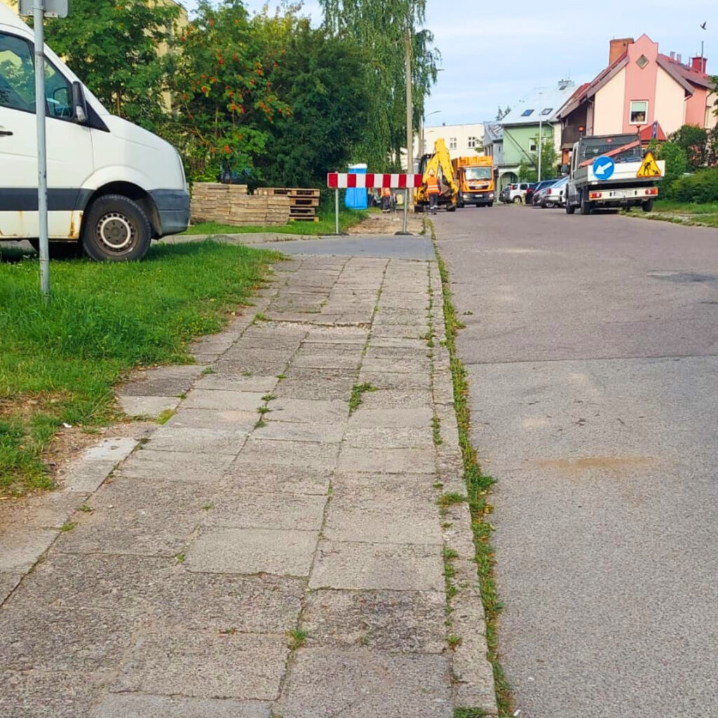 W poniedziałek rozpoczęły się prace remontowe na południowej stronie ulicy Ogińskiego w Suwałkach, obejmujące zarówno chodniki, jak i miejsca parkingowe.